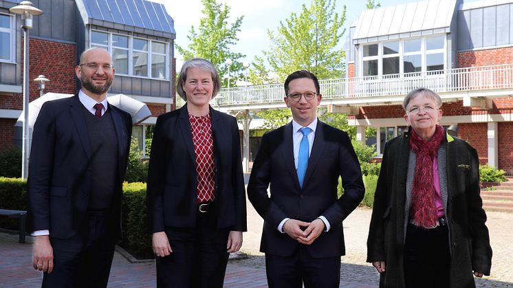 Prof. Dr. Kim-Patrick Sabla-Dimitrov, Vizepräsident für Lehre und Studium, Universitätspräsidentin Prof.in Dr.in Verena Pietzner, Minister Falko Mohrs und Dr.in Marion Rieken, Vizepräsidentin für Personal und Finanzen auf dem zentralen Campusgelände der Universität Vechta.