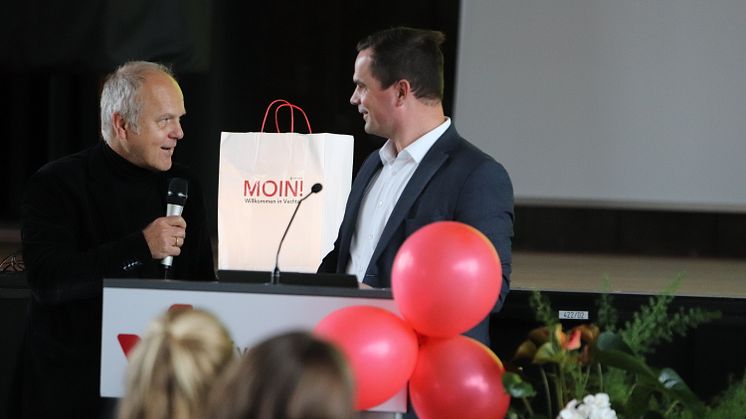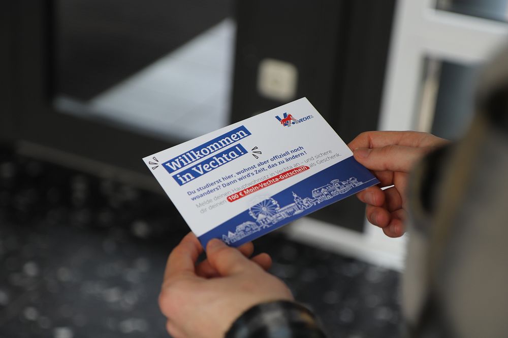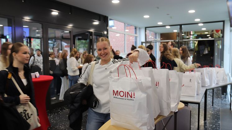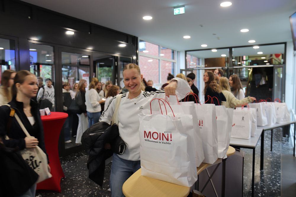 Dass die Stadt Vechta die Studierenden ebenso herzlich begrüßt, zeigte Bürgermeister Kristian Kater zusammen mit dem Interimspräsidenten beim Verteilen der „Ersti-Tüten“: Spaghetti, Fahrrad-Reparaturset, Süßes, Gutscheine, der Hinweis auf einen 100-Euro Studierendenbonus, wenn sich diese in Vechta mit ihrem Erstwohnsitz anmelden, und mehr haben das Stadtmarketing „Moin Vechta“ sowie die Universität Vechta durch Spenden von lokalen Unternehmen zusammengestellt. Praktisch: Wenn der Bürgermeister die Tüten während einer Politikvorlesung verteilt und gleich so spontan ist, dass er ein paar Lektionen in Kommunalpolitik gibt.
