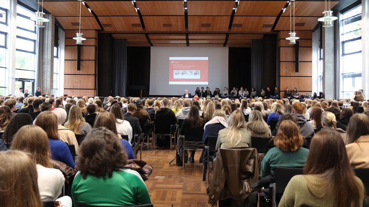 Die Sitzplätze der Aula reichen nicht aus – Heizkörper, Tische, Bühne und Boden müssen ebenso herhalten. Doch die Freude steht allen ins Gesicht geschrieben. Die Erstsemesterstudierenden der Universität Vechta – die „Erstis“ – machen ihrer Bezeichnung alle Ehre und nehmen an ihrer ersten Veranstaltung an der Hochschule teil. Begrüßt durch Christian Meyer, dem Leiter der Zentralen Studienberatung, folgen sie im weiteren Verlauf auch den Worten von Prof. Dr. Thomas Bals. „Was für ein toller Anblick“, fasst es der Interimspräsident zusammen. Ein Campus, der sich zunehmend mit Leben fülle, sei ein wunderbares Zeichen. Die endgültigen Anmeldezahlen liegen zwar erst in einigen Wochen vor, doch es zeichne sich ab, dass sich diese im Vergleich zu den vergangenen Jahren stabilisieren. „Wir sind glücklich, als Präsenzuni wieder durchstarten zu können!“ Überschneidungsfreie Veranstaltungen werden im Semester geboten, was an größeren Unis nicht selbstverständlich sei. Dazu noch ein gutes Betreuungsverhältnis und ein Campus, auf welchem man sich gut kennenlernen könne, nennt Bals nur ein paar der Uni-Vechta-Vorteile.