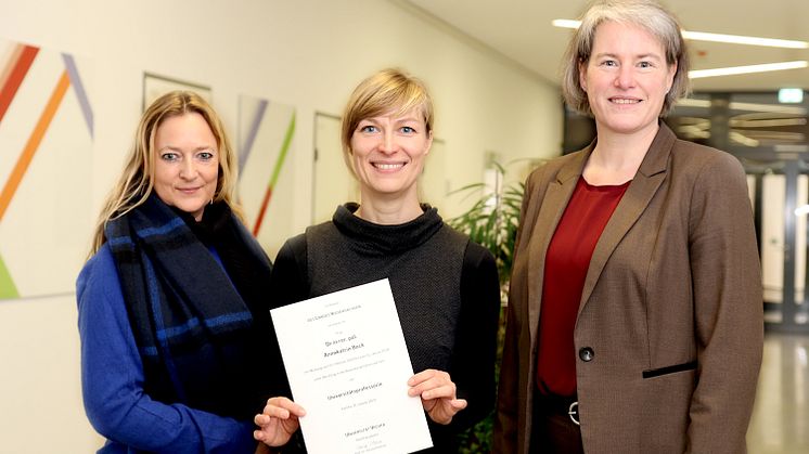 Bei der Urkundenübergabe Anfang Februar 2023 (v.l.): Prof.in Dr.in Jantje Halberstadt, Studiendekanin der Fakultät I, Prof.in Dr.in Annekatrin Bock - Stiftungsprofessorin für Medienforschung mit dem Schwerpunkt Digitalisierung der Bildung und damit wissenschaftliche Leitung des Medienkopetenzzentrums Vechta - und Prof.in Dr.in Verena Pietzner, Präsidentin der Universität Vechta