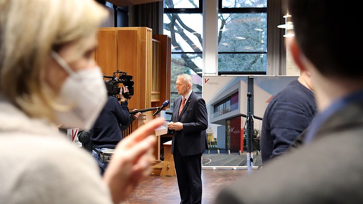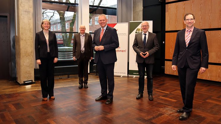 Am Mittwoch, 19.1.2022, hat Niedersachsens Minister für Wissenschaft und Kultur, Björn Thümler, die Bewilligung für einen großes Forschungs-Verbundprojekt überreicht. Sein Ministerium fördert das Vorhaben mit sechs Millionen Euro. An der Universität Vechta nahmen die Präsident*innen der drei antragstellenden Hochschulen die Bewilligung entgegen. Damit ist das Forschungsprojekt „4N“ für gesellschaftliche, technologische und ökologische Transformationen in Niedersachsen gestartet.