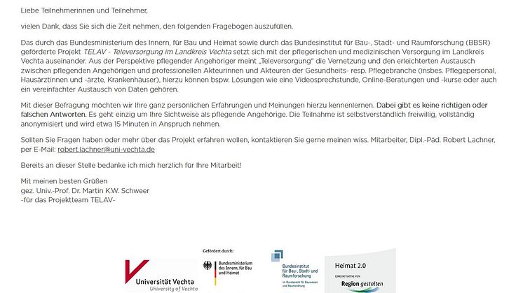 Für die Befragungen sucht die Uni Vechta derzeit noch pflegende Angehörige. „Die wissenschaftlichen Erhebungen bleiben selbstverständlich absolut anonym. Jede Person, die sich zu einer Befragung bereit erklärt, unterstützt perspektivisch die Versorgungsqualität in unserem Landkreis“, erläutert Prof. Dr. Martin K.W. Schweer seine Planungen. Interessierte, die ihre Angehörigen pflegen, seien also herzlich eingeladen, sich an der Umfrage zu beteiligen. An der Befragung kann man per Smartphone, Tablet oder Computer teilnehmen, indem man folgenden QR-Code oder den angegebenen Link verwendet: https://ww2.unipark.de/uc/TELAV/