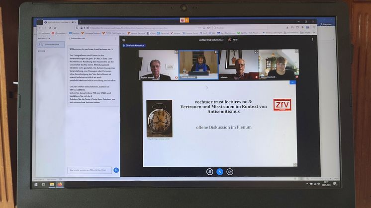 Die ehemalige Präsidentin des Zentralrates der Juden in Deutschland, Charlotte Knobloch, und die in der antisemitismuskritischen Bildungsarbeit aktive Vanessa Eisenhardt waren bei der dritten Ausgabe der „vechtaer trust lecture“ zu Gast. Dabei sprachen und diskutierten sie online zum Thema „Vertrauen und Misstrauen im Kontext von Antisemitismus“.