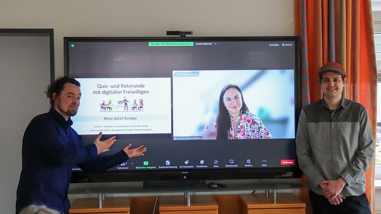 Auch wenn sie seit ihrer Berufung an die Universität Vechta vor sechs Jahren zusammen mit ihren Teams viele Drittmittelprojekte bewilligt bekommen hat, habe die jetzige Auszeichnung einen besonderen Stellenwert: „Wir sind besonders stolz darauf, denn wir wurden nicht nur von einem Expertengremium ausgewählt, sondern auch eine Bürger*innenjury hat sich für uns entschieden“, sagt Prof.in Dr.in Vanessa Mertins. „So viele Studierende der Universität Vechta haben in den vergangenen Monaten an dem Projekt in ihrer Freizeit gearbeitet, so viele Senior*innen in den Pflegeeinrichtungen waren begeistert von den Angeboten, die die jungen Menschen auf die Beine gestellt haben und so viele Kolleg*innen von innerhalb und außerhalb der Universität haben angeboten, mitzuwirken.“ Das habe das Team die vergangenen Monate wirklich beflügelt und all die durchgearbeiteten Nächte vergessen lassen. Auch bei der jetzigen Entscheidung über die Gewinnerteams gab es ebenfalls große Anteilnahme: „Alle haben mitgefiebert und sich regelmäßig erkundigt, ob es schon eine Rückmeldung vom BMBF gebe“, sagt Bernd Josef Leisen, wissenschaftliche Mitarbeiter im Fach. „Nun sind wir wirklich froh, dass wir die virtuellen Veranstaltungen mit unseren Verbundpartner*innen über zwei Jahre gemeinsam weiterentwickeln und erproben können und die virtuellen Veranstaltungen mit digitalen Freiwilligen langfristig im Betreuungs- und Freizeitangebot der Altenpflege zu verankern“, sagt Devin Kwasniok, ebenfalls wissenschaftlicher Mitarbeiter. Dafür wolle des Team 1000 Freiwillige mobilisieren, ergänzt Bernd Josef Leisen. In diese nächste Projektphase startet das Team um Prof.in Dr.in Vanessa Mertins mit zwei erfahrenen Verbundpartner*innen: Prof. Dr. Kai Koch (Uni Vechta) steuert als Musikpädagoge seine Expertise im Bereich altersgerechter Ausgestaltung der kulturellen Angebote bei. Prof.in Dr.in Elke Kalbe und Dr.in Ann-Christin Folkerts aus dem Bereich der medizinischen Psychologie von der Uniklinik Köln (beide vormals Uni Vechta) bringen ihre ausgewiesenen Kompetenzen in der Entwicklung und Evaluation von Interventionen zur Verlangsamung kognitiver Abbauprozesse ein. Auch mit Prof.in Dr.in Gabriele Nellissen (Recht der sozialen Dienstleistungen und Datenschutz) und Ass. jur. Kerstin Telscher (Leistungserbringungsrecht) von der Universität Vechta werde in der kommenden Phase eine weitere Zusammenarbeit angestrebt, so Prof.in Dr.in Vanessa Mertins.