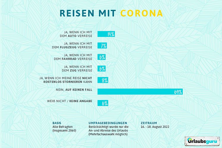 Vom 16. bis zum 18. August 2022 haben 2.060 stichprobenartig ausgewählte Frauen und Männer an der Umfrage teilgenommen und anhand eines Multiple-Choice-Systems die Frage „Denken Sie bitte nur an die An- und Abreise Ihres Urlaubs: Würden Sie mit einer Corona-Infektion verreisen?“ beantwortet. Folgende Antworten standen zur Auswahl: