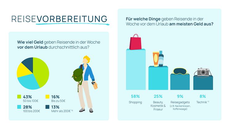 Dabei geben über die Hälfte der Befragten (56 Prozent) einen Großteil dieses Geldes in der Woche vor dem Urlaub für Shopping aus, ein Viertel hat die höchsten Ausgaben für Pflege- und Kosmetikprodukte oder für einen Frisör- oder Schönheitstermin. Rund neun Prozent geben vor ihrer Reise am meisten Geld für Reisegadgets aller Art aus und acht Prozent investieren den höchsten Anteil in (neue) Technik.