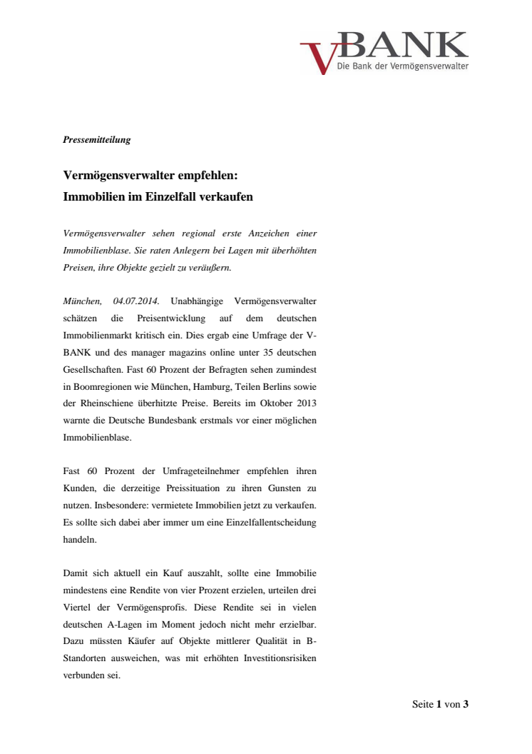 Vermögensverwalter sehen regional erste Anzeichen einer Immobilienblase. Sie raten Anlegern bei Lagen mit überhöhten Preisen, ihre Objekte gezielt zu veräußern.