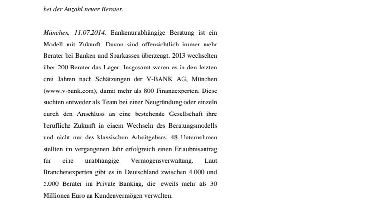 München, 11.07.2014. Bankenunabhängige Beratung ist ein Modell mit Zukunft. Davon sind offensichtlich immer mehr Berater bei Banken und Sparkassen überzeugt. 2013 wechselten über 200 Berater das Lager. Insgesamt waren es in den letzten drei Jahren nach Schätzungen der V-BANK AG, München (www.v-bank.com), damit mehr als 800 Finanzexperten. Diese suchten entweder als Team bei einer Neugründung oder einzeln durch den Anschluss an eine bestehende Gesellschaft ihre berufliche Zukunft in einem Wechseln des Beratungsmodells und nicht nur des klassischen Arbeitgebers. 48 Unternehmen stellten im vergangenen Jahr erfolgreich einen Erlaubnisantrag für eine unabhängige Vermögensverwaltung. Laut Branchenexperten gibt es in Deutschland zwischen 4.000 und 5.000 Berater im Private Banking, die jeweils mehr als 30 Millionen Euro an Kundenvermögen verwalten.