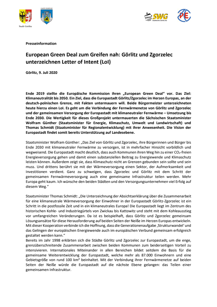 Ausbau der klimaneutralen Fernwärmeversorgung: Görlitz und Zgorzelec unterzeichnen Letter of Intent