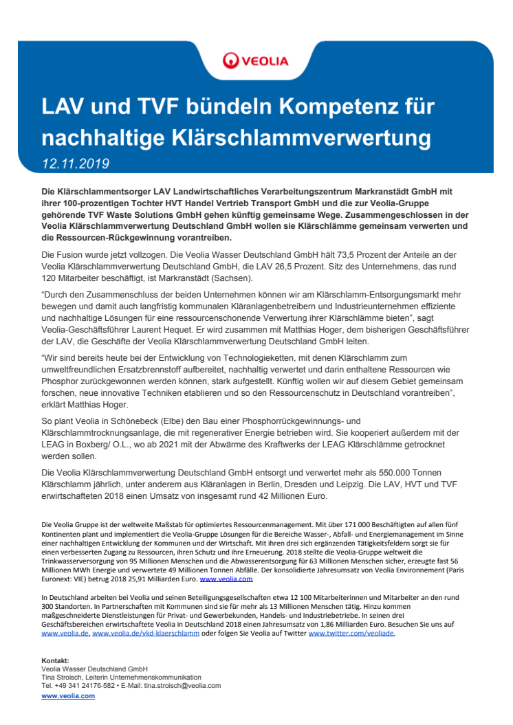 Die LAV Landwirtschaftliches Verarbeitungszentrum Markranstädt GmbH mit ihrer 100-prozentigen Tochter HVT Handel Vertrieb Transport GmbH und die zur Veolia-Gruppe gehörende TVF Waste Solutions GmbH gehen künftig gemeinsame Wege. Zusammengeschlossen in der Veolia Klärschlammverwertung Deutschland GmbH wollen sie Klärschlämme gemeinsam verwerten und die Ressourcen-Rückgewinnung vorantreiben.
