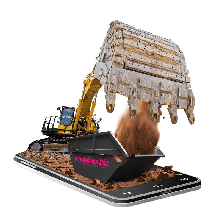 Wastebox - Die einfachste Art Abfall zu entsorgen. Grafik aus Bagger, Smartphone und Bauschuttmulde.