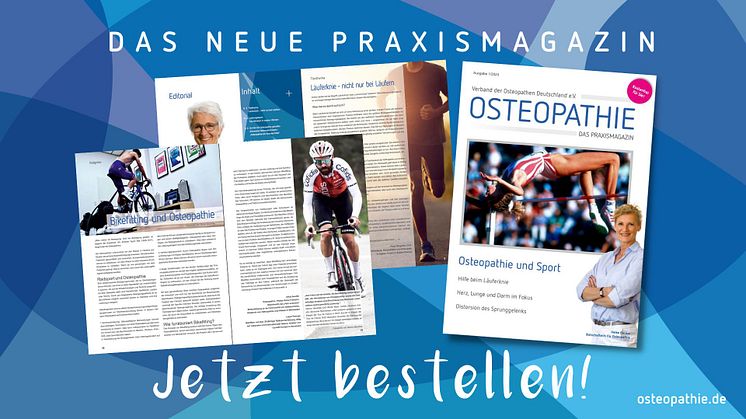 Die 12. Ausgabe des Patientenmagazins „Osteopathie - das Praxismagazin" ist erschienen: Im Mittelpunkt steht das Thema „Osteopathie und Sport“. Patientengerecht verfasste Berichte von VOD-Mitgliedern unter anderem über die Erfolge und Einsatzmöglichkeiten von Osteopathie im Leistungssport, über Distorsionstraumen bei Sportlern, das so genannte Läufer-Knie sowie ein Interview und ein Bericht mit einem Para-Eishockeyspieler und einer Torhüterin über ihre Erfahrungen mit Osteopathie sind Teil des Magazins. Mehr noch: Die mehrfache Weltmeisterin und Olympiasiegerin im Hochsprung, Osteopathie-Botschafterin Heike Henkel, gibt der Ausgabe mit den Coverbildern und ihrer positiven Meinung zur Osteopathie eine besondere Bedeutung. Forschungsergebnisse, ein Buchtipp und Ratgeberseiten runden das Info-Magazin ab.