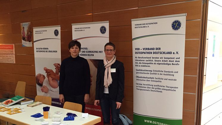„Es hat sich gelohnt hier zu sein, um der Bevölkerung die Osteopathie noch näher zu bringen“, bilanziert Osteopathin Heidi Vollet (li.). Gemeinsam mit ihren Kolleginnen und VOD-Mitgliedern Julia Bieringer (re.) und Ute Zimmer hatte die Expertin aus Neuendettelsau am Sonntag beim Ansbacher Gesundheitstag Fragen der Besucher beantwortet und am VOD-Informationsstand auf Wunsch Broschüren über Osteopathie, die neue Patientenzeitung "Osteopathie - das Praxismagazin" und Therapeutenlisten verteilt. „Viele haben sich den Flyer mitgenommen, und die Patientenzeitung kam gut an“, so Heidi Vollet, die auch den Austausch mit ihren Kolleginnen als positiv empfand. Ein interessiertes Publikum verfolgte ab 15.30 Uhr den Vortrag von Julia Bieringer zum Thema „Osteopathie am Kind“. „Schön war es, dass die Zielgruppe Kind gut vertreten und ein reges Interesse an der Osteopathie und der Qualitätssicherung zu spüren war“, freut sich die Referentin.