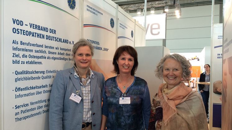Die vierte „Sonderschau Osteopathie“ vom 19. bis 21. März 2015 auf der Fachmesse therapie Leipzig war ein voller Erfolg: „Wir konnten am Stand des Verbandes der Osteopathen Deutschland (VOD) wichtige berufspolitische Hinweise geben, es gab zahlreiche Fragen zur Berufsanerkennung, Nachfragen zu Richt- beziehungsweise Leitlinien bezüglich Ausbildung und Zugangsvoraussetzungen zur Osteopathie-Ausbildung sowie Fragen zur Kostenerstattung durch GKV“, fassen Thorsten Hanf und Karin Röhrich D.O. zusammen. Die beiden Osteopathen aus Halle und Zwenkau unterstützten VOD-Mitarbeiterin Karin Klöpfel am Info-Stand des Berufsverbandes. Ebenso wie die Osteopathinnen Elke Gorn und Karin Herbst aus Leipzig sowie Marion Hochberg aus Dessau-Roßlau: „Ich fand es gut, es hat mir Spaß gemacht, hier am VOD-Stand den interessierten Besuchern Fragen zu beantworten und Infomaterial mitgeben zu können. Es war auffällig, dass viele Jüngere, zum Teil noch in Ausbildung zum Physiotherapeuten, sich schon für die Zukunft orientieren“, meint sie und Osteopathin Hendrikje Adler aus Halle, die bereits zum dritten Mal bei der Messe dabei war, ergänzt: „Begeistert hat mich wie jedes Mal das große und breit gefächerte Interesse von Therapeuten, Ärzten, Patienten und vielen anderen Bevölkerungsgruppen.“