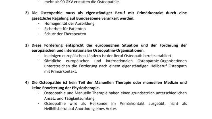 Deutschland hinkt anderen Ländern hinterher: Die Forderung nach der Anerkennung einer eigenständigen Medizinform mit Primärkontakt, also mit Diagnosestellung, entspricht auch den Zielen der europäischen und weltweit tätigen Berufsverbände und den Richtlinien der Weltgesundheitsorganisation WHO aus dem Jahr 2010. Seit Inkrafttreten des Versorgungsstrukturgesetzes Anfang 2012 erstatten derzeit schon mehr als 90 Gesetzliche Krankenversicherungen (GKV) anteilig die Kosten für Osteopathie-Behandlungen. Die Voraussetzungen der GKV für die Erstattungsleistungen sind jedoch völlig uneinheitlich, was ebenfalls den Regelungsbedarf unterstreicht.