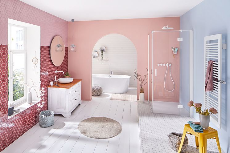 Helle Blau-, Grün- und Rottöne sowie pastellige Farben, die weiterhin im Trend liegen, eignen sich gut, um beispielsweise eine Wand im Badezimmer frühlingshaft in Szene zu setzen.