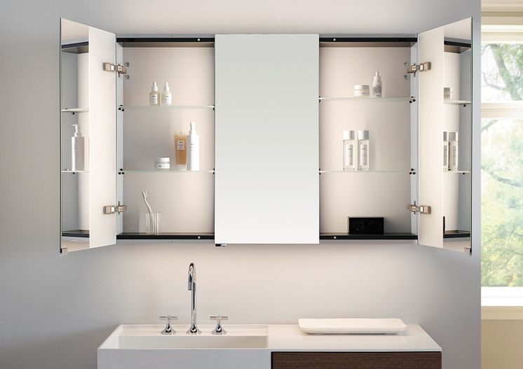 Wer Wert auf schlichtes, zeitloses Design legt und gleichzeitig hohe funktionale Ansprüche stell, ist mit dem Spiegelschrank rl30 gut bedient. Die mittige Spiegeltür ermöglicht eine komfortable Nutzung auch bei geöffneten Türen – und zwar ohne Qualitätsverlust bei der weichen, indirekten Gesichtsausleuchtung, die über die Position der beiden lichtstreuenden Diffusorflächen an den Innenseiten der Spiegeltüren individuell gesteuert werden kann. In der Variante mit verspiegelten Außenwänden macht sich der rl30 gerade in einem kleinen Badezimmer zudem fast unsichtbar. Foto: burgbad