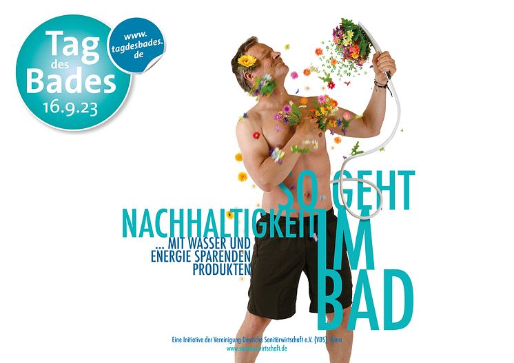 Herzlich willkommen! Zum Tag des Bades am Samstag, 16. September 2023 laden bundesweit Badstudios des Handwerks und Ausstellungen des Fachgroßhandels zum Besuch ein. Der Aktionstag Tag des Bades soll den Zugang für Interessierte, die sich ein neues Badezimmer wünschen, erleichtern. Plakat: Vereinigung Deutsche Sanitärwirtschaft e.V. (VDS)