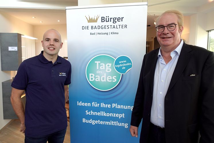 Der diesjährige thematische Fokus inklusive der entsprechenden Kommunikationsmaßnahmen kam beim Handwerk gut an: „Das Thema Nachhaltigkeit wird zunehmend wichtig. Und wir können auch gut an das Thema andocken, da einige der größten deutschen Sanitärhersteller wie burgbad, Viega oder Dornbracht hier in der Region ansässig sind. Darauf achten mittlerweile viele unserer Kunden und Kundinnen, und entsprechend ist das auch ein super Verkaufsargument“, bestätigte etwa Marc Bürger (Die Badgestalter, Eslohe, links im Bild; rechts: VDS-Geschäftsführer Jens J. Wischmann). Foto: Vereinigung Deutsche Sanitärwirtschaft e.V. (VDS)