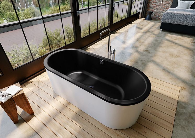 Himmlische Erholung auf Erden: Das kann ein Wannenbad bieten, wenn das richtige Design ins Spiel kommt. Freistehende Modelle für zwei und gerne in Bicolor liegen im Trend. Und bitte mitten im Raum – zum königlichen Hof halten. (Foto: Kaldewei; ClassicDuoOval)