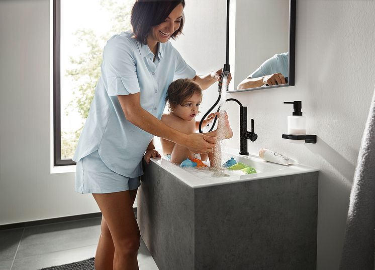 Flexibel Schwarzsehen: Diese Armaturen-Neuheit bedient den Trend nach einer Dosis Dunklem im Bad perfekt. Überdies erfüllt sie den Wunsch, den Waschplatz problemlos auf unterschiedlichste Anforderungen einstellen zu können. (Foto: Hansgrohe; FinorisFlex)