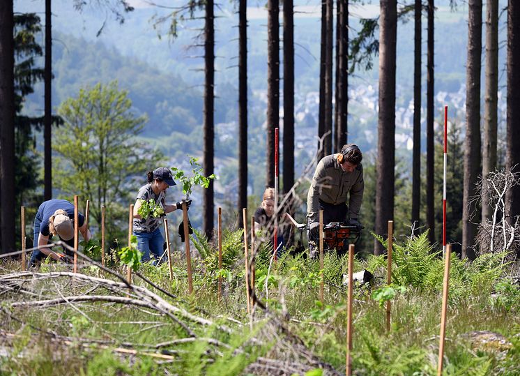 Wer bei der Einrichtung des Bades Produkte aus natürlichen Rohstoffen und Materialien einsetzt, die langlebig sind, schont ganz klar Ressourcen. Kein Wunder, dass Holz von vielen Bauherrinnen und Bauherren favorisiert wird, vor allem, wenn es aus heimischen Wäldern stammt. Doch denen geht es mittlerweile gar nicht gut. Das wiederum bringt Badhersteller auf den wunderbaren Plan, sich nicht nur auf den Ausbau der ohnehin schon CO2-armen Produktion zu konzentrieren, sondern sie helfen sogar dabei, das wertvolle Grün vor der eigenen Haustür aufzuforsten. (Foto: burgbad)