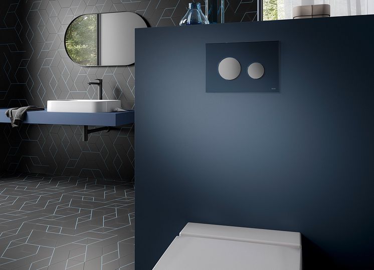 Dass Farbe im Trend liegt und zur Individualität der Badeinrichtung beiträgt, beweist einmal mehr diese Hingucker-Glasblende für die WC-Spülung im wohnlichen Ton „Abendblau“. Akzente gehen aber auch von den Fugen aus. Meist in Weiß oder in Zementgrau gewählt, sind sie in diesem Fall in Blau gehalten, und zwar in einer an Abendblau angelehnten, etwas helleren Nuance. Auf diese Weise heben sie sich besser von den anthrazitfarbenen Fliesen ab, ohne jedoch den Raum zu dominieren. Die Einrichtung wirkt lebendig, aber nicht unruhig, auch, weil eben nicht komplett mit blauer Masse verfugt wurde. (Foto: Tece; TECELoop)