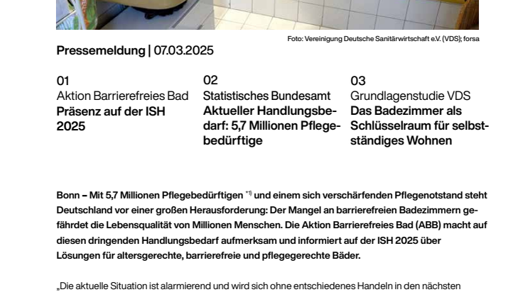 Mit 5,7 Millionen Pflegebedürftigen *1) und einem sich verschärfenden Pflegenotstand steht Deutschland vor einer großen Herausforderung: Der Mangel an barrierefreien Badezimmern gefährdet die Lebensqualität von Millionen Menschen. Die Aktion Barrierefreies Bad (ABB) macht auf diesen dringenden Handlungsbedarf aufmerksam und informiert auf der ISH 2025 über Lösungen für altersgerechte, barrierefreie und pflegegerechte Bäder.