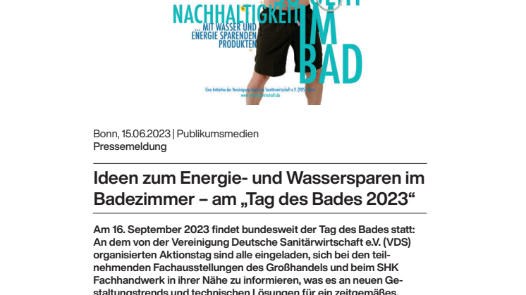 Am 16. September 2023 findet bundesweit der Tag des Bades statt: An dem von der Vereinigung Deutsche Sanitärwirtschaft e.V. (VDS) organisierten Aktionstag sind alle eingeladen, sich bei den teilnehmenden Fachausstellungen des Großhandels und beim SHK Fachhandwerk in ihrer Nähe zu informieren, was es an neuen Gestaltungstrends und technischen Lösungen für ein zeitgemäßes, ressourcensparendes Badezimmer gibt.
