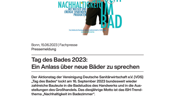 Der Aktionstag der Vereinigung Deutsche Sanitärwirtschaft e.V. (VDS) „Tag des Bades“ lockt am 16. September 2023 bundesweit wieder zahlreiche Bauleute in die Badstudios des Handwerks und in die Ausstellungen des Großhandels. Das diesjährige Motto ist das ISH-Trendthema „Nachhaltigkeit im Badezimmer“.