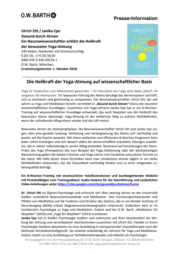 Die bewusste Führung des Atems beruhigt das Nervensystem und hilft, sich zu zentrieren und gleichzeitig zu entspannen. Der Neurowissenschaftler Ulrich Ott vermittelt hierzu die neuesten wissenschaftlichen Grundlagen. Zusammen mit Yoga-Lehrerin Janika Epe hat er ein 8-Wochen-Training auf wissenschaftlicher Grundlage entwickelt, das auch Skeptiker von der Heilkraft des bewussten Atems überzeugt.