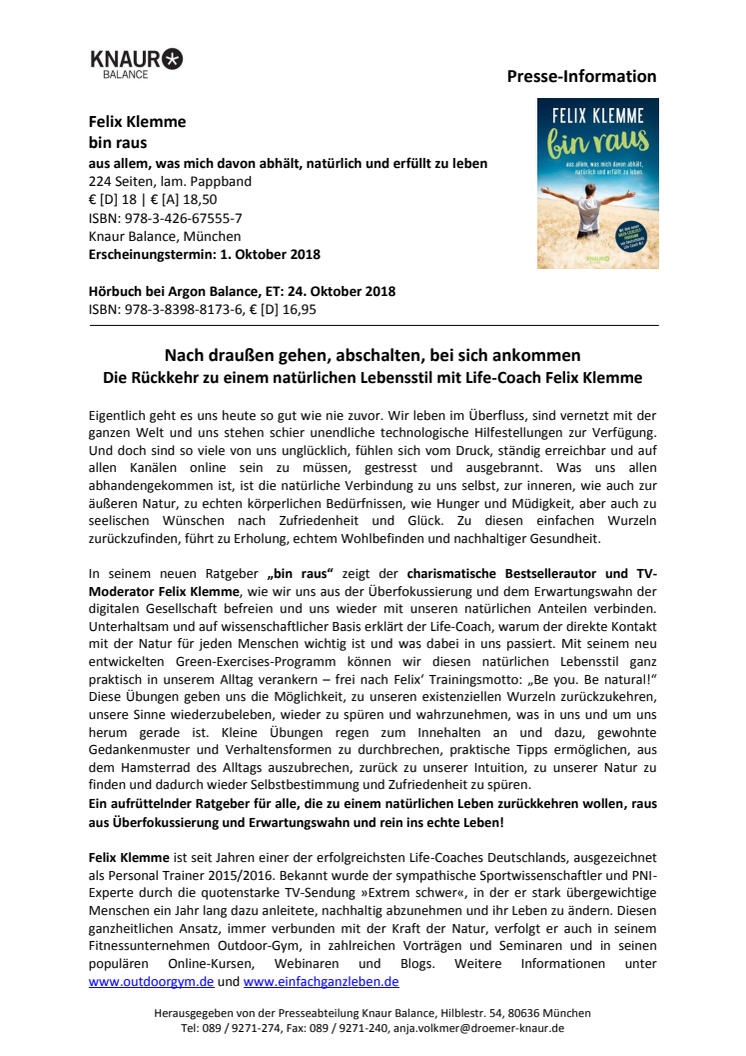 In seinem neuen Ratgeber zeigt der charismatische Bestsellerautor und TV-Moderator Felix Klemme, wie wir uns aus der Überfokussierung und dem Erwartungswahn der digitalen Gesellschaft befreien und uns wieder mit unseren natürlichen Anteilen verbinden. Unterhaltsam und auf wissenschaftlicher Basis erklärt der Life-Coach, warum der direkte Kontakt mit der Natur für jeden Menschen wichtig ist.