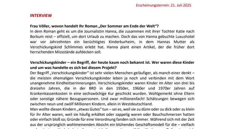 Der Sommer am Ende der Welt erscheint am 21. Juli 2025. Bei Interesse schicke ich Ihnen gerne das pdf vorab oder das Buch zu. Auch steht Eva Völler für Interviews zur Verfügung.