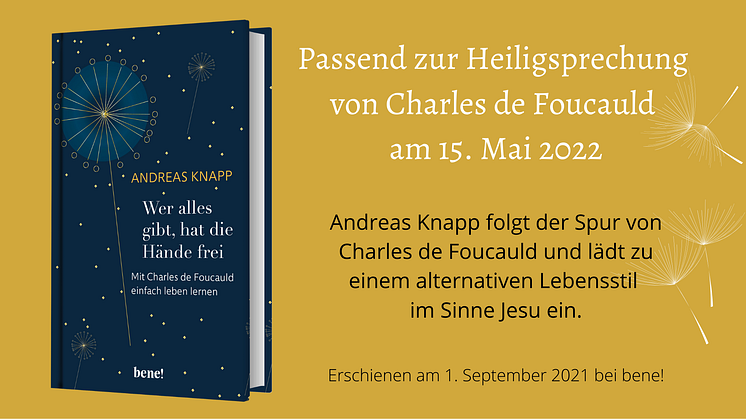 Autor und Ordensbruder Andreas Knapp hat sich eingehend mit Charles de Foucauld beschäftigt und folgt der Spur des Offiziers und Lebemannes, der Ende des 19. Jahrhunderts eine radikale Lebenswende vollzog, in seinem Buch "Wer alles gibt, hat die Hände frei. Mit Charles de Foucauld einfach leben lernen" (bene!/Droemer Knaur, Sept 2021).