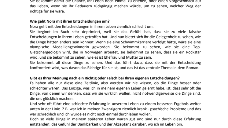 Genau dort findet sich Nora Seed wieder, nachdem sie aus lauter Verzweiflung beschlossen hat, sich das Leben zu nehmen. An diesem Ort zwischen Raum und Zeit, an dem die Uhrzeiger immer auf Mitternacht stehen, hat sie plötzlich die Möglichkeit, all das umzukehren, was ihr Leben aus der Bahn gebracht hat. Aber kann man in einem anderen Leben glücklich werden, wenn man weiß, dass es nicht das eigene ist?
