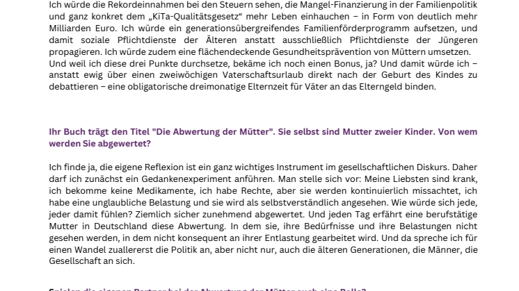 Dabei ist der Einsatz der Mütter – privat und beruflich – von zunehmender, ja essenzieller Bedeutung für die Zukunftsfähigkeit dieses Landes. Der Arbeitskräftemangel sowie der demografische Wandel lassen es nur noch kurios erscheinen, dass massenhaft gut ausgebildete Mütter vom Arbeitsmarkt ferngehalten werden, weil institutionelle Betreuungssysteme versagen, überkommene Mütterbilder Frauen unter Druck setzen und fragilere Familienstrukturen weniger zuverlässig sind. Der schlechte Umgang mit Müttern hat gesamtwirtschaftliche Konsequenzen.