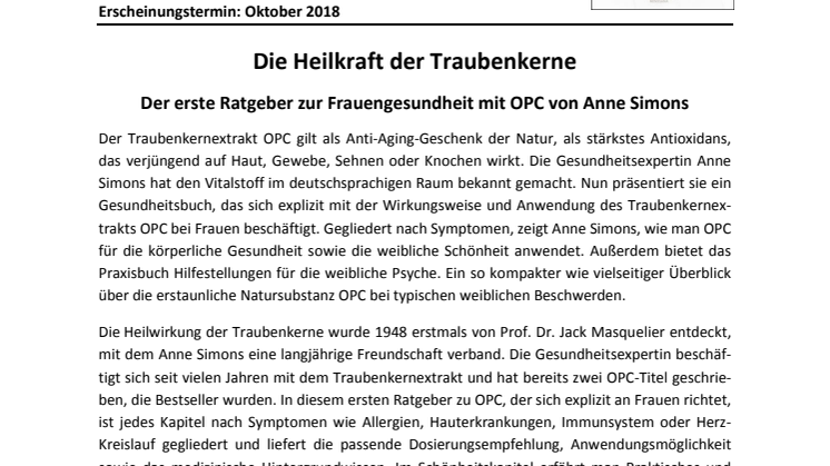 Der Traubenkernextrakt OPC gilt als Anti-Aging-Geschenk der Natur, als stärkstes Antioxidans, das verjüngend auf Haut, Gewebe, Sehnen oder Knochen wirkt. Die Gesundheitsexpertin Anne Simons hat den Vitalstoff im deutschsprachigen Raum bekannt gemacht. Nun präsentiert sie ein Gesundheitsbuch, das sich explizit mit der Wirkungsweise und Anwendung des Traubenkernextrakts OPC bei Frauen beschäftigt. Gegliedert nach Symptomen, zeigt Anne Simons, wie man OPC für die körperliche Gesundheit sowie die weibliche Schönheit anwendet. Außerdem bietet das Praxisbuch Hilfestellungen für die weibliche Psyche. Ein so kompakter wie vielseitiger Überblick über die erstaunliche Natursubstanz OPC bei typischen weiblichen Beschwerden.
