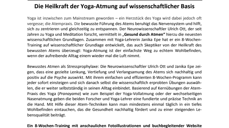 Yoga ist inzwischen zum Mainstream geworden – ein Herzstück des Yoga wird dabei jedoch oft vergessen; die Atempraxis. Die bewusste Führung des Atems beruhigt das Nervensystem und hilft, sich zu zentrieren und gleichzeitig zu entspannen. Der Neurowissenschaftler Ulrich Ott, der seit Jahren zu Yoga und Meditation forscht, vermittelt in „Gesund durch Atmen“ hierzu die neuesten wissenschaftlichen Grundlagen. Zusammen mit Yoga-Lehrerin Janika Epe hat er ein 8-Wochen-Training auf wissenschaftlicher Grundlage entwickelt, das auch Skeptiker von der Heilkraft des bewussten Atems überzeugt: Yoga-Atmung ist der einfachste Weg zu echtem Wohlbefinden, wenn der aufreibende Alltag einem wieder mal die Luft nimmt.