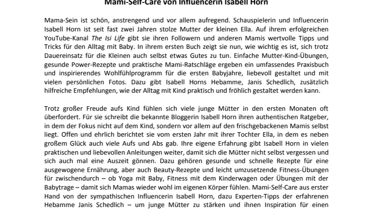 Mama-Sein ist schön, anstrengend und vor allem aufregend. Schauspielerin und Influencerin Isabell Horn ist seit fast zwei Jahren stolze Mutter der kleinen Ella. Auf ihrem erfolgreichen YouTube-Kanal The Isi Life gibt sie ihren Followern und anderen Mamis wertvolle Tipps und Tricks für den Alltag mit Baby. In ihrem ersten Buch zeigt sie nun, wie wichtig es ist, sich trotz Dauereinsatz für die Kleinen auch selbst etwas Gutes zu tun. Einfache Mutter-Kind-Übungen, gesunde Power-Rezepte und praktische Mami-Ratschläge ergeben ein umfassendes Praxisbuch und inspirierendes Wohlfühlprogramm für die ersten Babyjahre, liebevoll gestaltet und mit vielen persönlichen Fotos. Dazu gibt Isabell Horns Hebamme, Janis Schedlich, zusätzlich hilfreiche Empfehlungen, wie der Alltag mit Kind praktisch und fröhlich gestaltet werden kann.