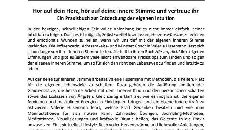 In der heutigen, schnelllebigen Zeit voller Ablenkung ist es nicht immer einfach, seiner Intuition zu folgen. Doch es ist möglich, Selbstzweifel loszulassen, Herzenswünsche zu erfüllen und emotionale Wunden zu heilen, wenn wir uns tief mit der eigenen inneren Stimme verbinden. Die Influencerin, Achtsamkeits- und Mindset Coachin Valerie Husemann lässt sich schon lange von ihrer inneren Stimme leiten. Sie teilt in ihrem Buch Hör auf dich! ihre eigenen Erfahrungen und gibt außerdem viele leicht anwendbare Praxistipps zum Finden und Folgen der eigenen inneren Stimme, um so für sich den richtigen Lebensweg zu finden und intuitiv zu leben.