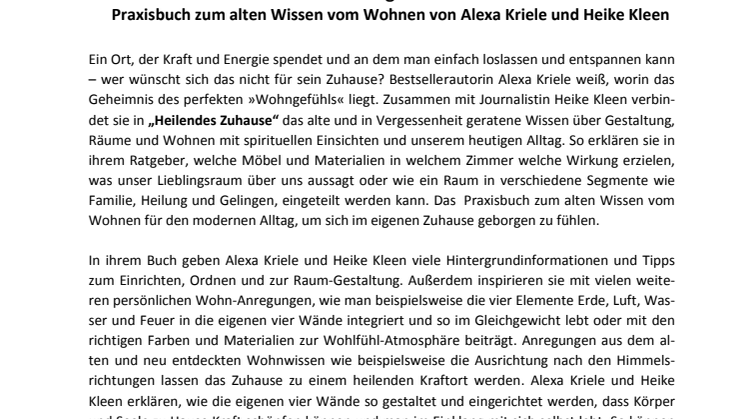 Ein Ort, der Kraft und Energie spendet und an dem man einfach loslassen und entspannen kann – wer wünscht sich das nicht für sein Zuhause? Bestsellerautorin Alexa Kriele weiß, worin das Geheimnis des perfekten »Wohngefühls« liegt. Zusammen mit Journalistin Heike Kleen verbindet sie in „Heilendes Zuhause“ das alte und in Vergessenheit geratene Wissen über Gestaltung, Räume und Wohnen mit spirituellen Einsichten und unserem heutigen Alltag.