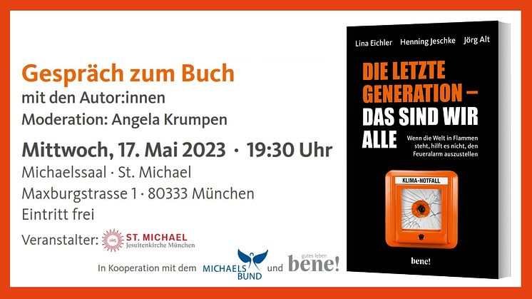 am Mittwoch, den 17. Mai 2023 um 19:30 Uhr findet im Michaelssaal (Maxburgstraße 1, 80333 München) ein Gespräch mit den Autor:innen des kürzlich erschienenen Buches »Die Letzte Generation – das sind wir alle« (bene!/Droemer Knaur) – Lina Eichler, Henning Jeschke und Jesuitenpater Jörg Alt – statt. Moderiert wird der Abend von Journalistin Angela Krumpen.