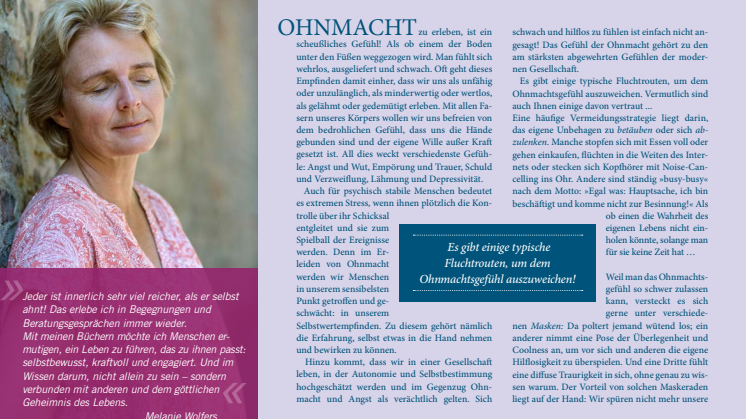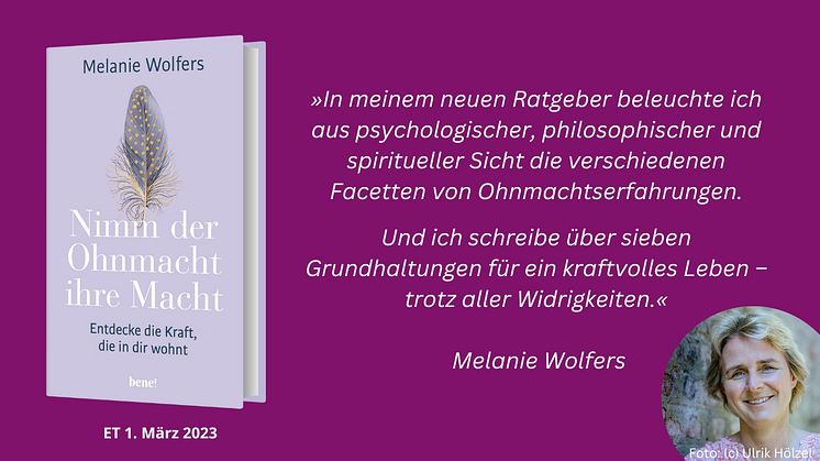Bestsellerautorin Melanie Wolfers zeigt in ihrem neuen Ratgeber »Nimm der Ohnmacht ihre Macht« (ET 1.03.2023 bei bene! / Droemer Knaur) auf, wie wir besser mit Situationen umgehen können, in denen wir uns ausgeliefert fühlen. Sie beschreibt sieben Grundhaltungen, die uns helfen, der Ohnmacht ihre Macht zu nehmen und die Kraft zu entdecken, die in uns wohnt.