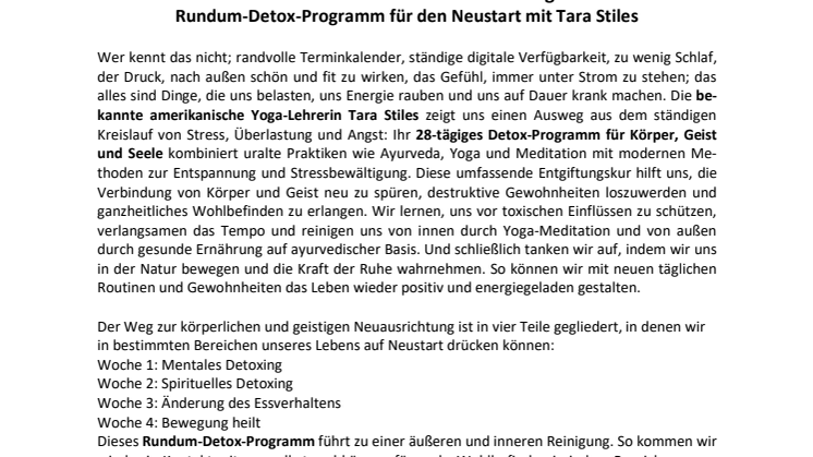 Wer kennt das nicht; randvolle Terminkalender, ständige digitale Verfügbarkeit, zu wenig Schlaf, der Druck, nach außen schön und fit zu wirken, das Gefühl, immer unter Strom zu stehen; das alles sind Dinge, die uns belasten, uns Energie rauben und uns auf Dauer krank machen. Die bekannte amerikanische Yoga-Lehrerin Tara Stiles zeigt uns einen Ausweg aus dem ständigen Kreislauf von Stress, Überlastung und Angst: Ihr 28-tägiges Detox-Programm für Körper, Geist und Seele kombiniert uralte Praktiken wie Ayurveda, Yoga und Meditation mit modernen Methoden zur Entspannung und Stressbewältigung. Diese umfassende Entgiftungskur hilft uns, die Verbindung von Körper und Geist neu zu spüren, destruktive Gewohnheiten loszuwerden und ganzheitliches Wohlbefinden zu erlangen. Wir lernen, uns vor toxischen Einflüssen zu schützen, verlangsamen das Tempo und reinigen uns von innen durch Yoga-Meditation und von außen durch gesunde Ernährung auf ayurvedischer Basis. Und schließlich tanken wir auf, indem wir uns in der Natur bewegen und die Kraft der Ruhe wahrnehmen. So können wir mit neuen täglichen Routinen und Gewohnheiten das Leben wieder positiv und energiegeladen gestalten.