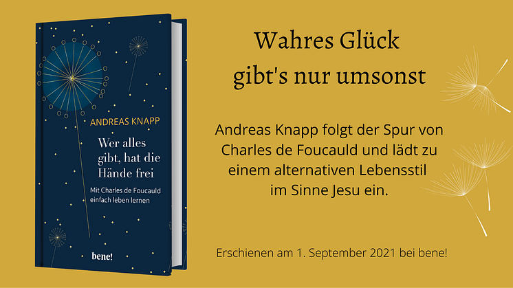 immer mehr zu besitzen wird uns als »Glück« angepriesen. Doch viele haben längst gemerkt, dass dies so nicht stimmt. Andreas Knapp lädt in seinem neuen Buch »Wer alles gibt, hat die Hände frei« (bene! Verlag, 1.09.2021) zu einem alternativen Lebensstil und Lebensgefühl ein. Hier und jetzt im Sinne Jesu zu leben.