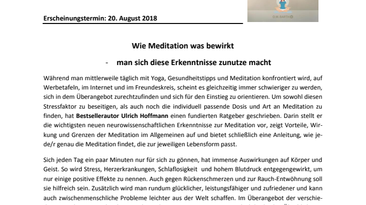 Während man mittlerweile täglich mit Yoga, Gesundheitstipps und Meditation konfrontiert wird, auf Werbetafeln, im Internet und im Freundeskreis, scheint es gleichzeitig immer schwieriger zu werden, sich in dem Überangebot zurechtzufinden und sich für den Einstieg zu orientieren. Um sowohl diesen Stressfaktor zu beseitigen, als auch noch die individuell passende Dosis und Art an Meditation zu finden, hat Bestsellerautor Ulrich Hoffmann einen fundierten Ratgeber geschrieben. Darin stellt er die wichtigsten neuen neurowissenschaftlichen Erkenntnisse zur Meditation vor, zeigt Vorteile, Wirkung und Grenzen der Meditation im Allgemeinen auf und bietet schließlich eine Anleitung, wie jede/r genau die Meditation findet, die zur jeweiligen Lebensform passt.