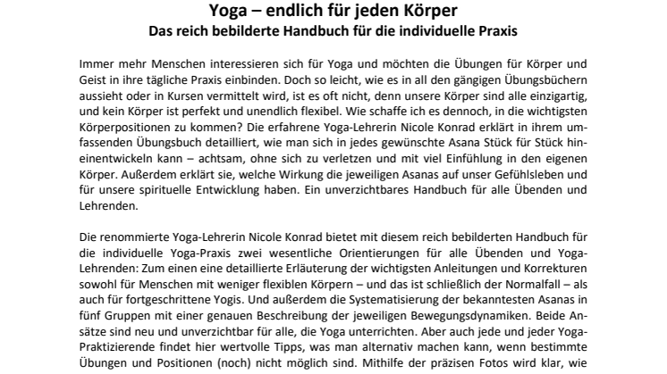 Die renommierte Yoga-Lehrerin Nicole Konrad bietet mit diesem reich bebilderten Handbuch für die individuelle Yoga-Praxis zwei wesentliche Orientierungen für alle Übenden und Yoga-Lehrenden: Zum einen eine detaillierte Erläuterung der wichtigsten Anleitungen und Korrekturen sowohl für Menschen mit weniger flexiblen Körpern – und das ist schließlich der Normalfall – als auch für fortgeschrittene Yogis. Und außerdem die Systematisierung der bekanntesten Asanas in fünf Gruppen mit einer genauen Beschreibung der jeweiligen Bewegungsdynamiken. Beide Ansätze sind neu und unverzichtbar für alle, die Yoga unterrichten. Aber auch jede und jeder Yoga-Praktizierende findet hier wertvolle Tipps, was man alternativ machen kann, wenn bestimmte Übungen und Positionen (noch) nicht möglich sind. Mithilfe der präzisen Fotos wird klar, wie genau die Ausrichtungen und Adjustments funktionieren. Davon profitieren nicht nur die Yoga-Lehrenden, sondern auch die Übenden.
