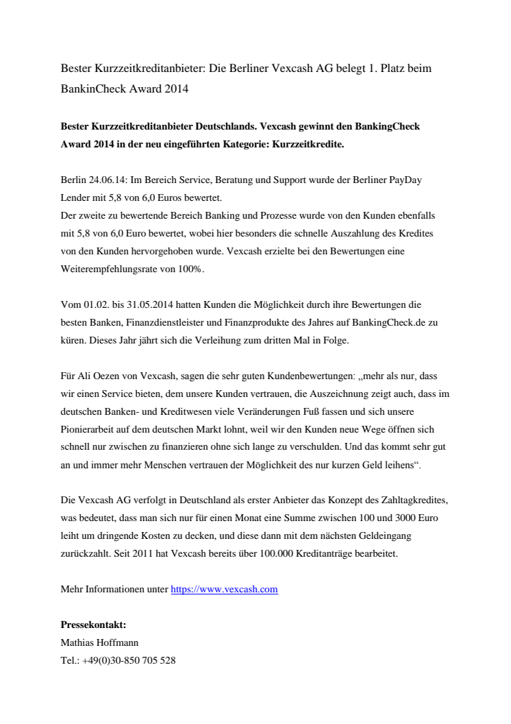 Bester Kurzzeitkreditanbieter Deutschlands. Vexcash gewinnt den BankingCheck Award 2014 in der neu eingeführten Kategorie: Kurzzeitkredite.