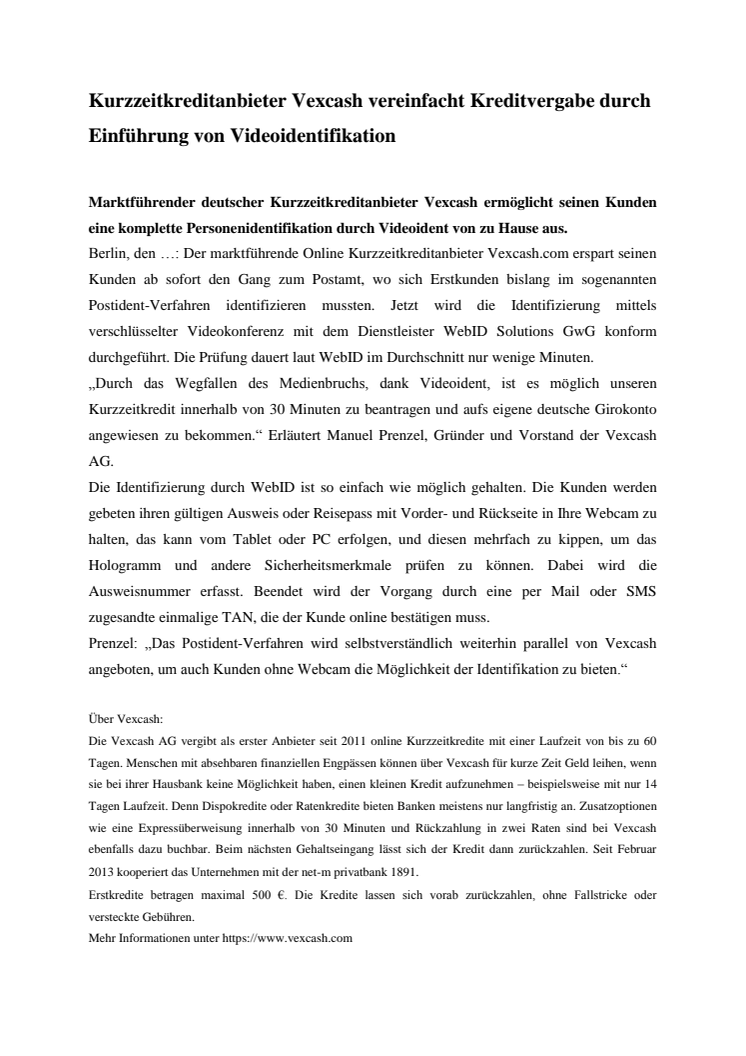 Marktführender deutscher Kurzzeitkreditanbieter Vexcash ermöglicht seinen Kunden eine komplette Personenidentifikation durch Videoident von zu Hause aus.