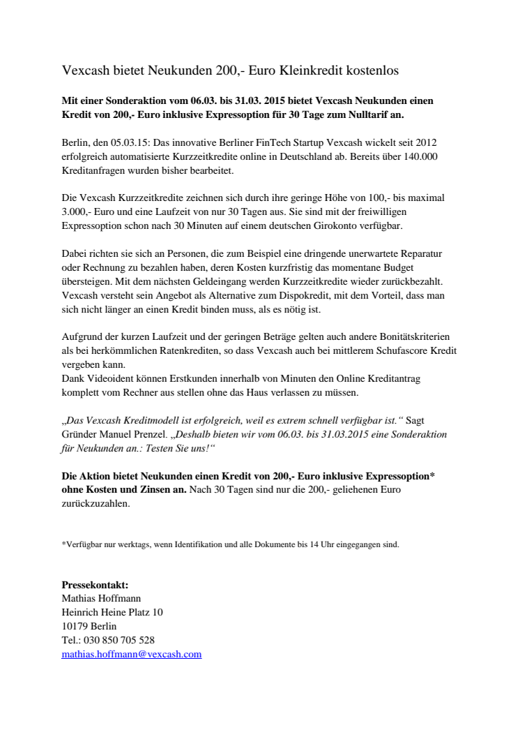 Mit einer Sonderaktion vom 06.03. bis 31.03. 2015 bietet Vexcash Neukunden einen Kredit von 200,- Euro inklusive Expressoption für 30 Tage zum Nulltarif an.